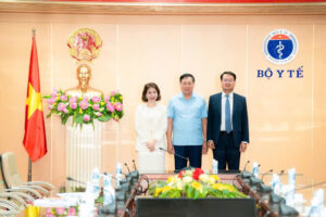 Bà Hàn Thị Khánh Vinh, Tổng Giám đốc Tổng công ty Dược Việt Nam – CTCP (Vinapharm) và ông Kim Hyoung Ki, Phó Chủ tịch kiêm Tổng Giám đốc phụ trách kinh doanh toàn cầu Tập đoàn Dược phẩm Celltrion Hàn Quốc chụp ảnh lưu niệm với Thứ trưởng Đỗ Xuân Tuyên tại buổi làm việc.