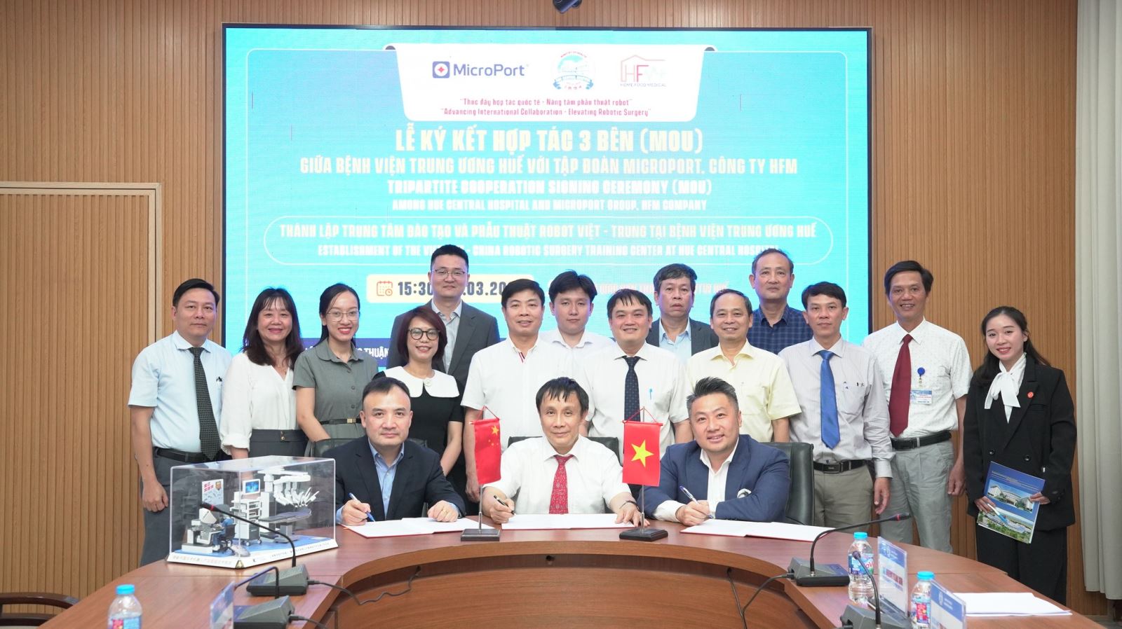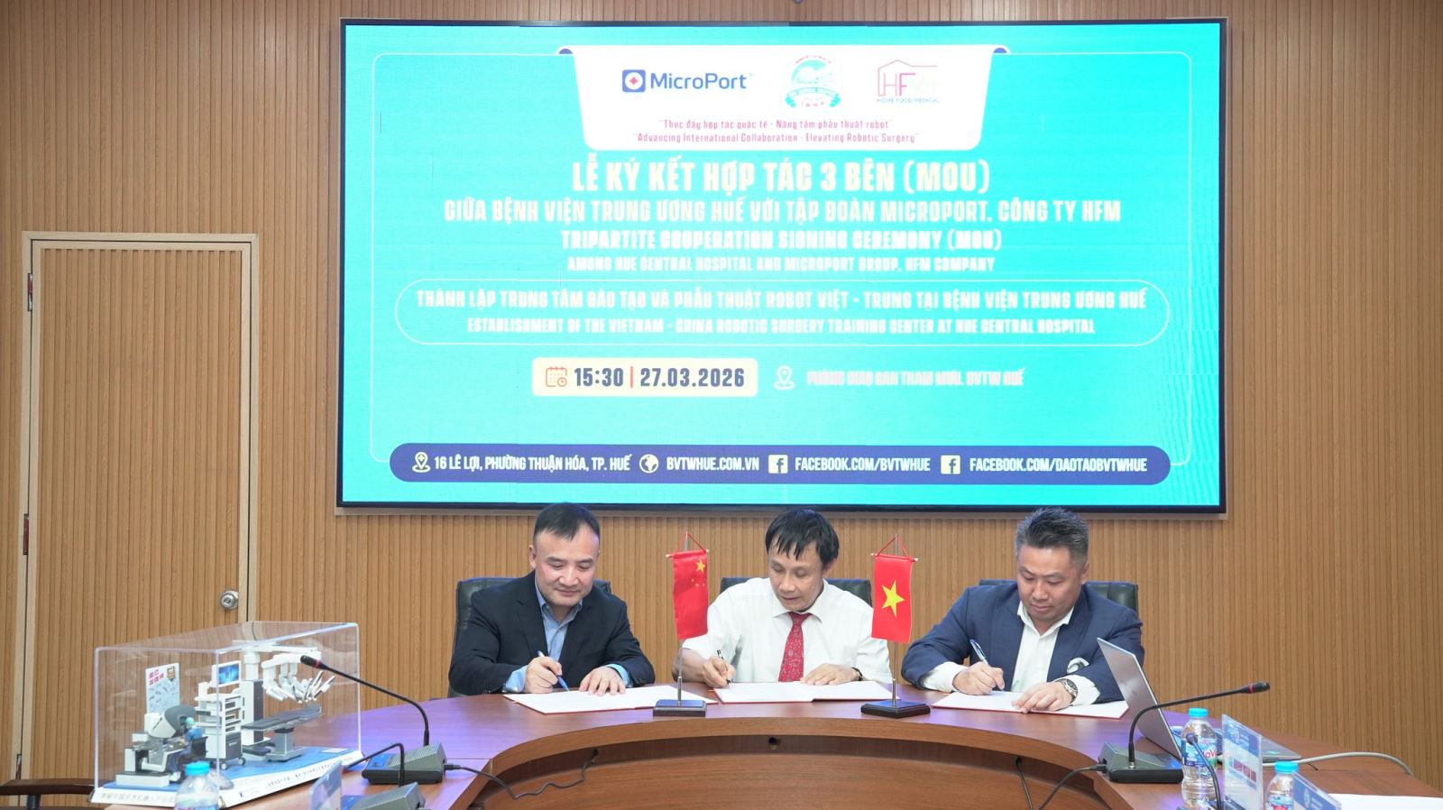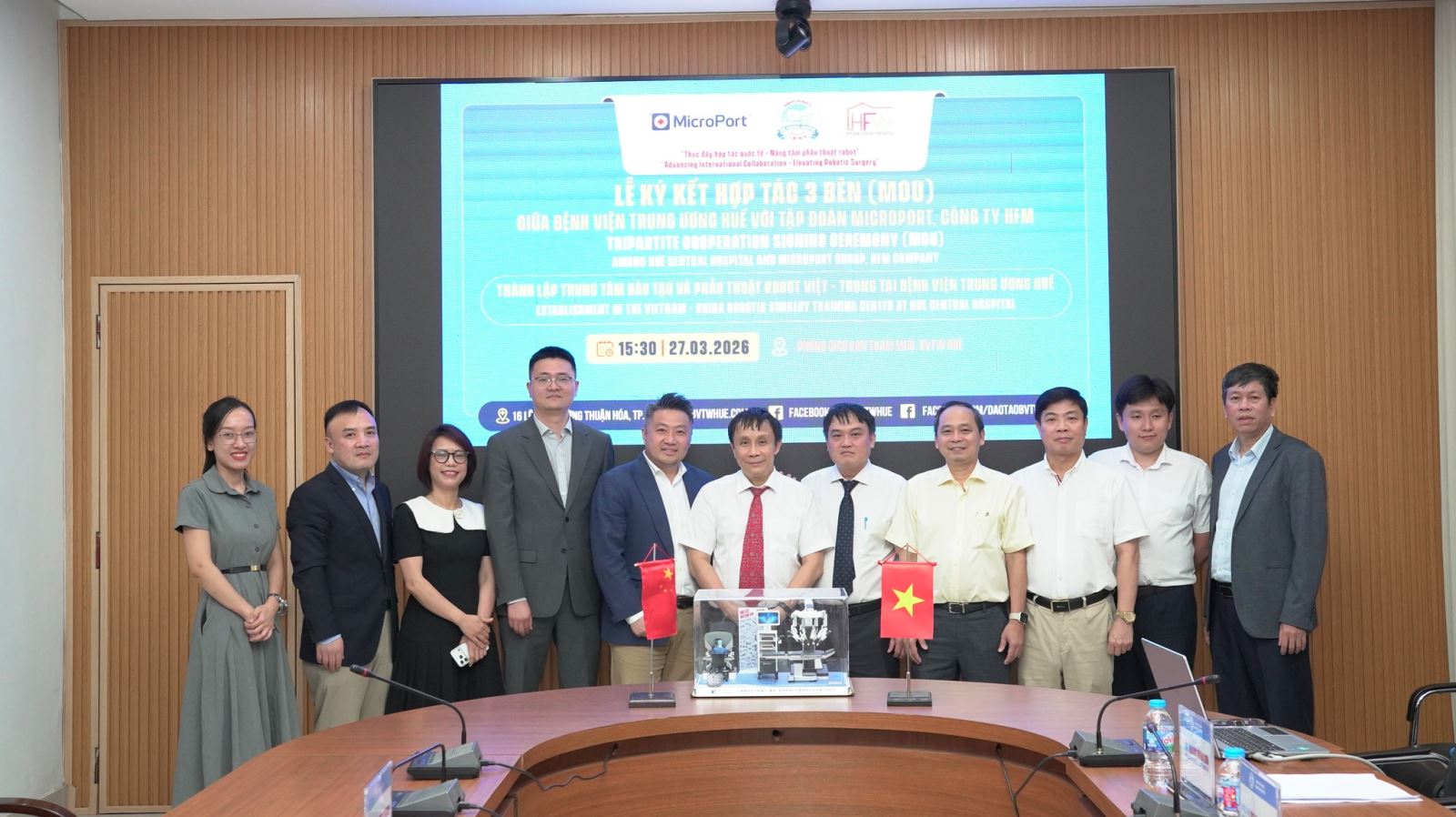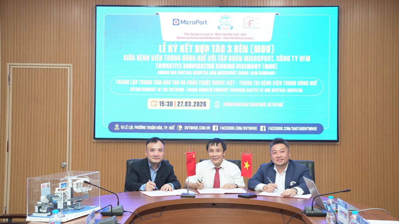 Chiều ngày 27/03/2026, Bệnh viện Trung ương (BVTW) Huế đã chính thức ký kết Biên bản ghi nhớ hợp tác (MOU) cùng MicroPort MedBot, Trung Quốc và HFM nhằm thành lập Trung tâm Đào tạo Phẫu thuật Robot Việt – Trung đầu tiên tại Việt Nam.
