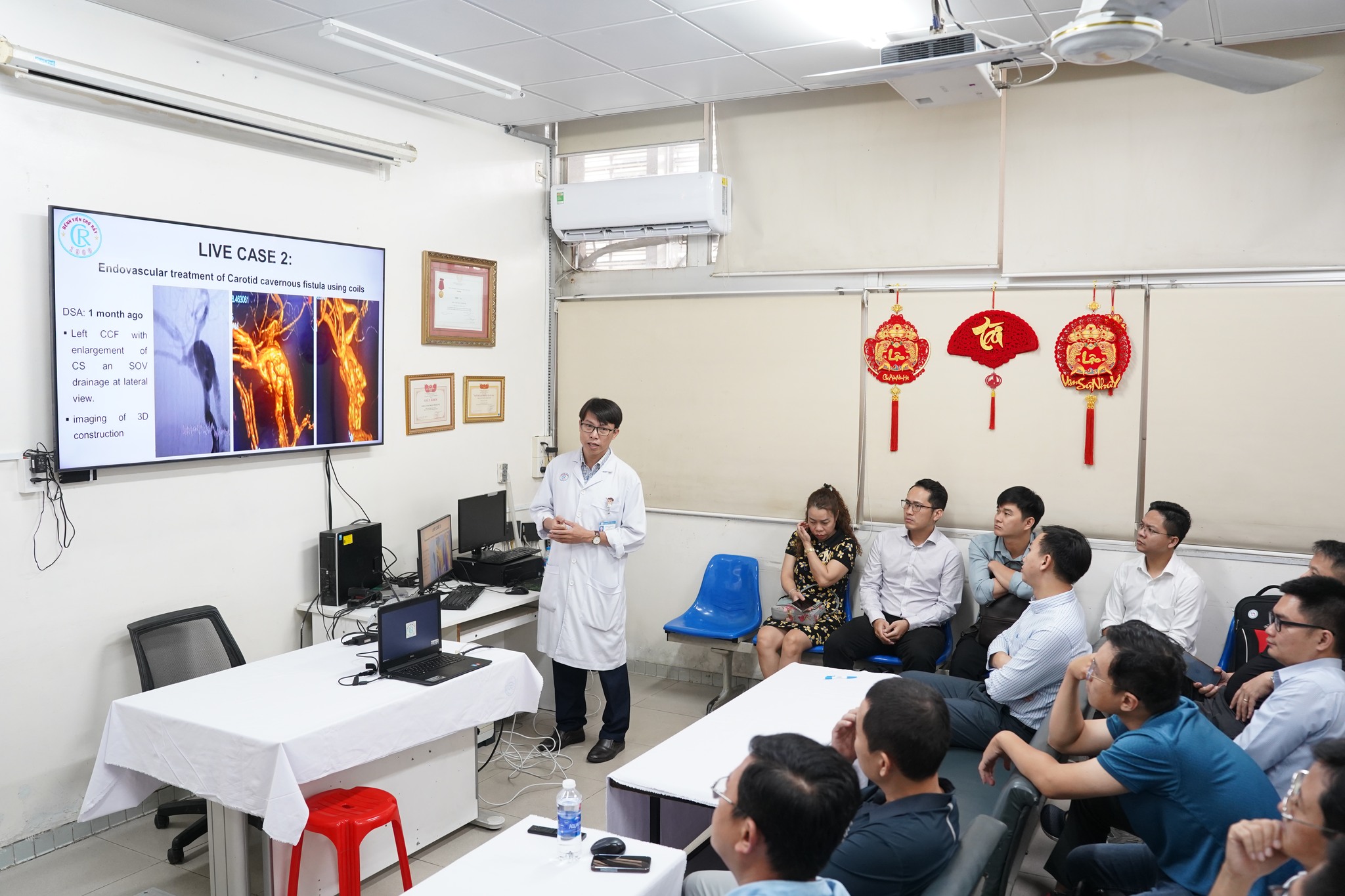 Bên cạnh phần trình bày bằng các báo cáo thì Ban Tổ chức cũng thiết kế 1 phiên thực hành do các chuyên gia của BV Chợ Rẫy thị phạm, liên quan đến các kỹ thuật can thiệp nội mạch như đặt stent thay đổi dòng chảy trong điều trị phình động mạch não, điều trị dò động mạch cảnh xoang hang bằng coil lông tách mạch, điều trị hẹp động mạch dưới gối bằng dụng cụ khoan cắt mảng xơ vữa, điều trị ung thư biểu mô tế bào gan bằng hạt vi cầu tải thuốc.