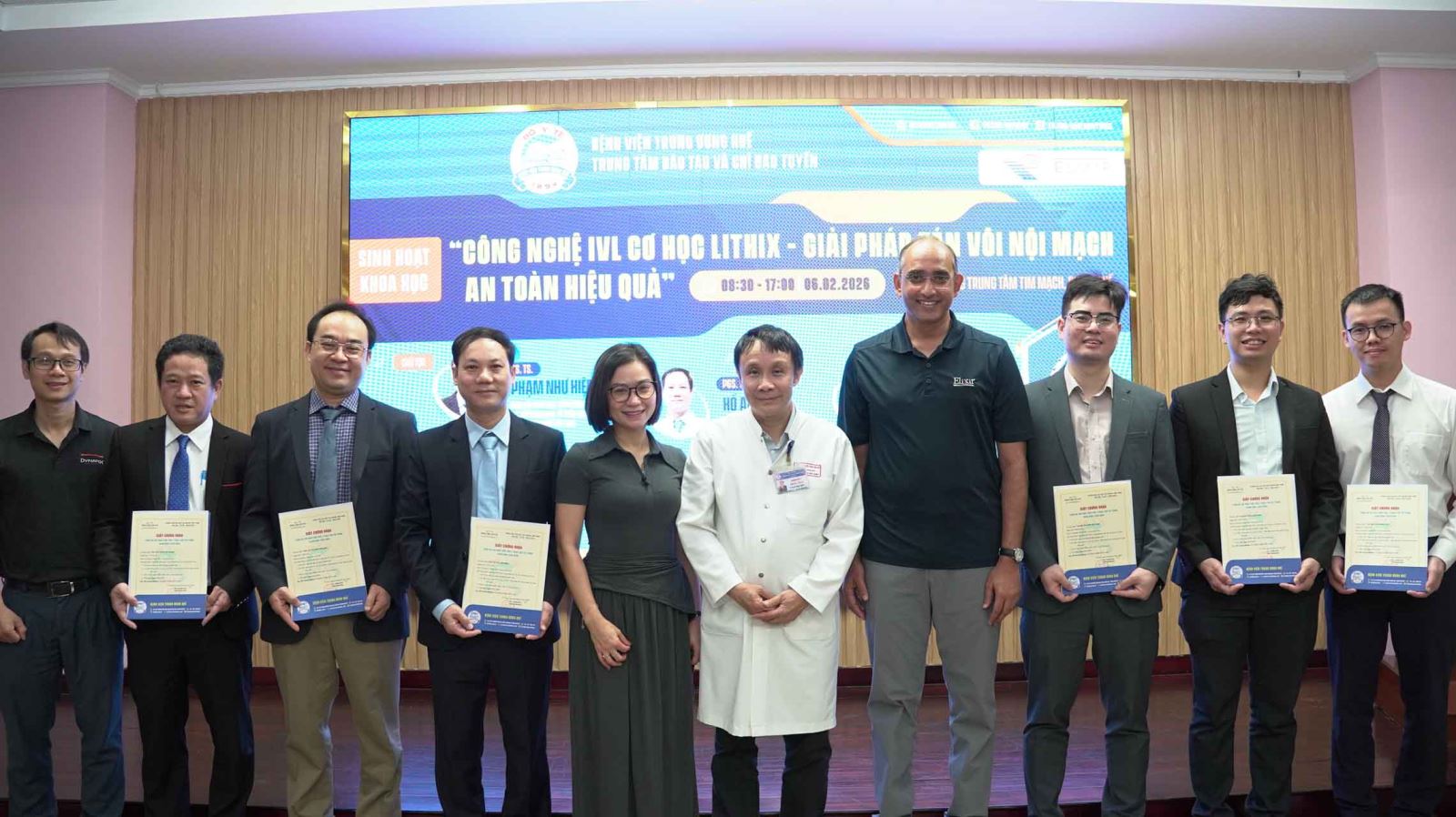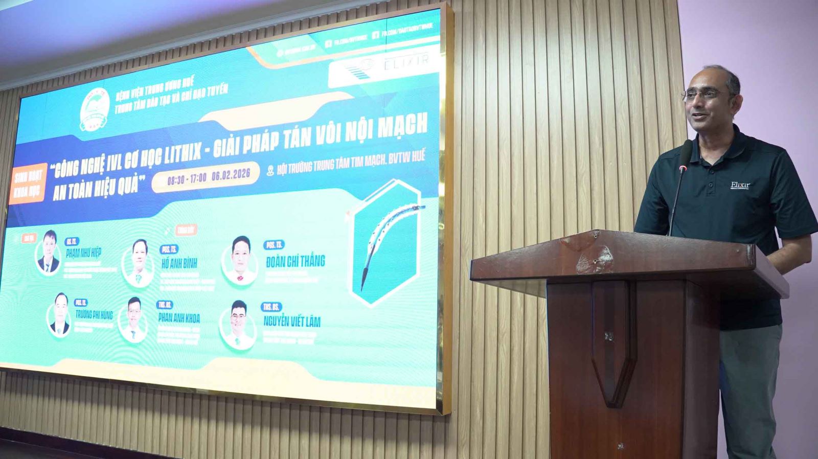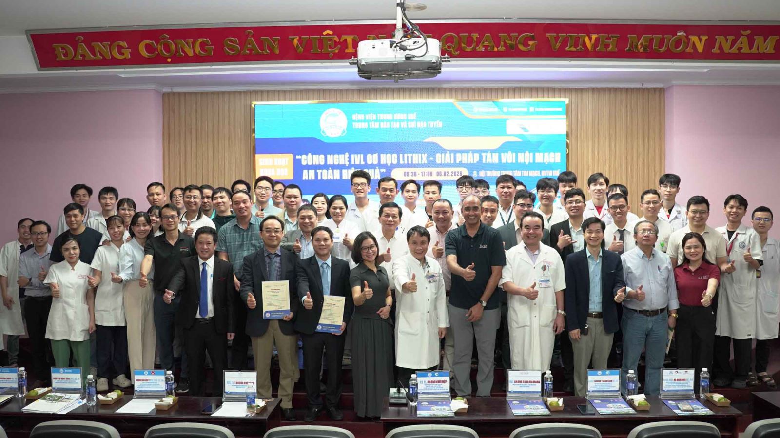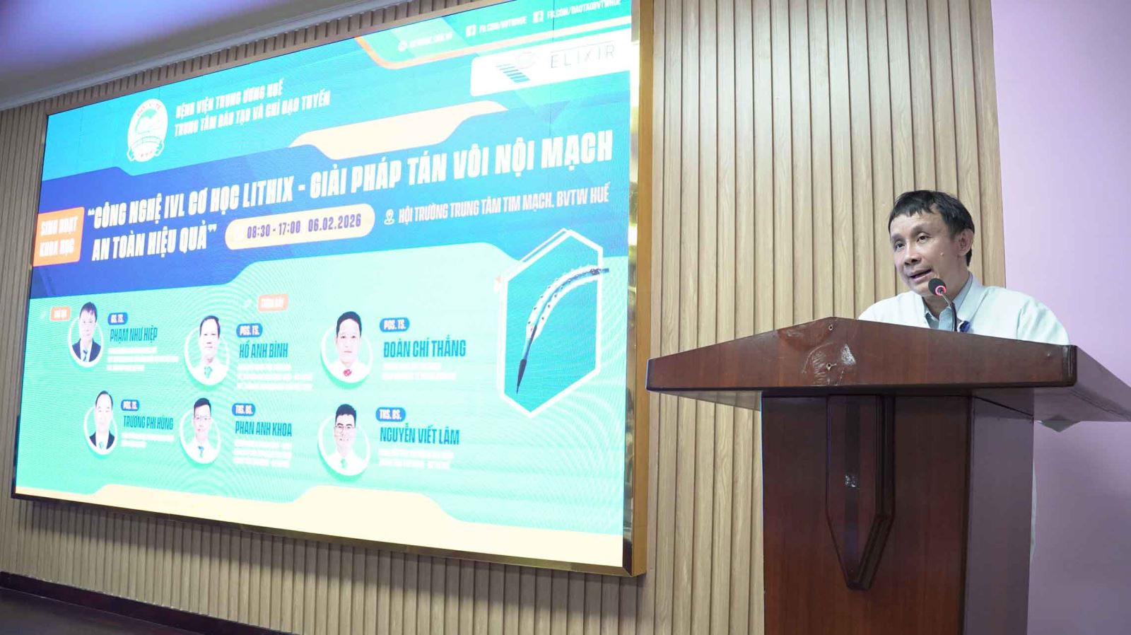 Sáng ngày 06/02/2026, tại Hội trường Trung tâm Tim mạch, Bệnh viện Trung ương (BVTW) Huế phối hợp với Công ty Elixir Medical Corporation tại Việt Nam và Công ty Việt Thắng tổ chức sinh hoạt khoa học với chuyên đề “Công nghệ IVL cơ học LithiX – Giải pháp giải tán vôi nội mạch an toàn hiệu quả”. Chương trình nhằm cập nhật các tiến bộ mới trong xử trí tổn thương động mạch vành vôi hóa nặng, một thách thức lớn trong thực hành tim mạch can thiệp hiện nay.