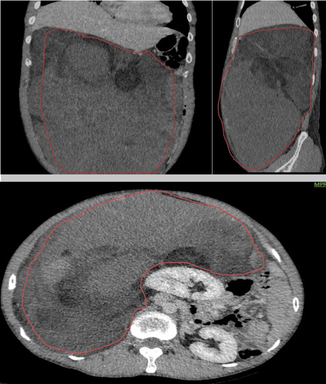– CTscanner ổ bụng: Phát triển từ khoang sau phúc mạc bên phải có khối lớn kích thước khoảng 253x127mm, tỷ trọng hỗn hợp gồm phần đặc ngấm thuốc sau tiêm, thành phần nang dịch, mỡ và các ổ tăng tỷ trọng tự nhiên trước tiêm dạng máu cục lớn nhất kích thước khoảng 83×64 mm theo dõi liposarcoma. Khối lớn đẩy thận phải ra trước, sang trái sát đường giữa, đẩy nhu mô gan lên trên và đẩy các quai ruột trong ổ bụng sang trái. Không ghi nhận tổn thương ở các cơ quan khác.