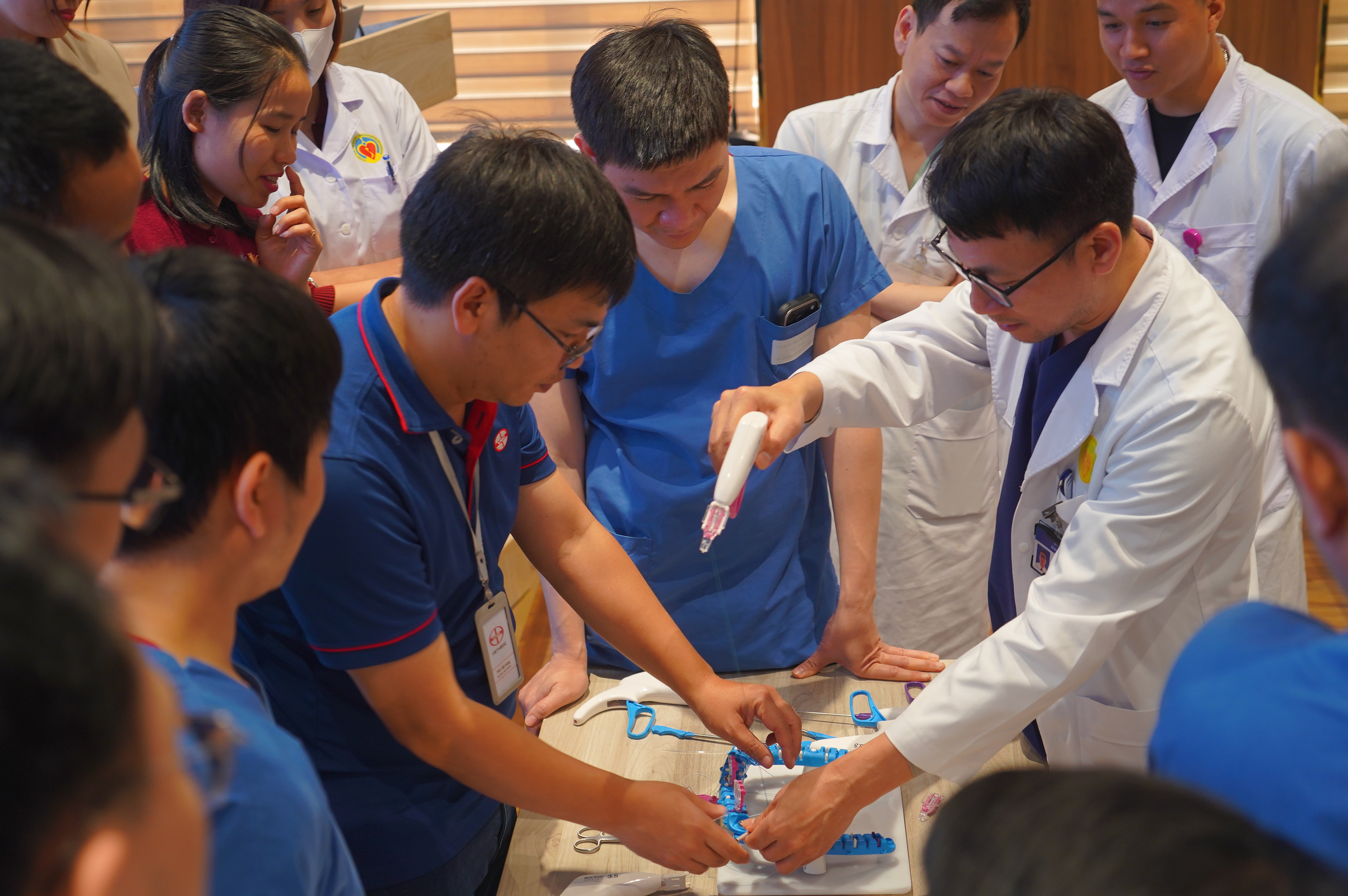 Đây là chương trình giới thiệu về giải pháp khâu cố định van nhân tạo trong phẫu thuật thay van tim xâm lấn tối thiểu đã thu hút đông đảo nhiều phẫu thuật viên của Trung tâm tim mạch, Bệnh viện E và đi kèm với chương trình thực hành trên mô hình để các bác sĩ tiếp cận nhanh chóng mà không cần quy trình đào tạo quá phức tạp.