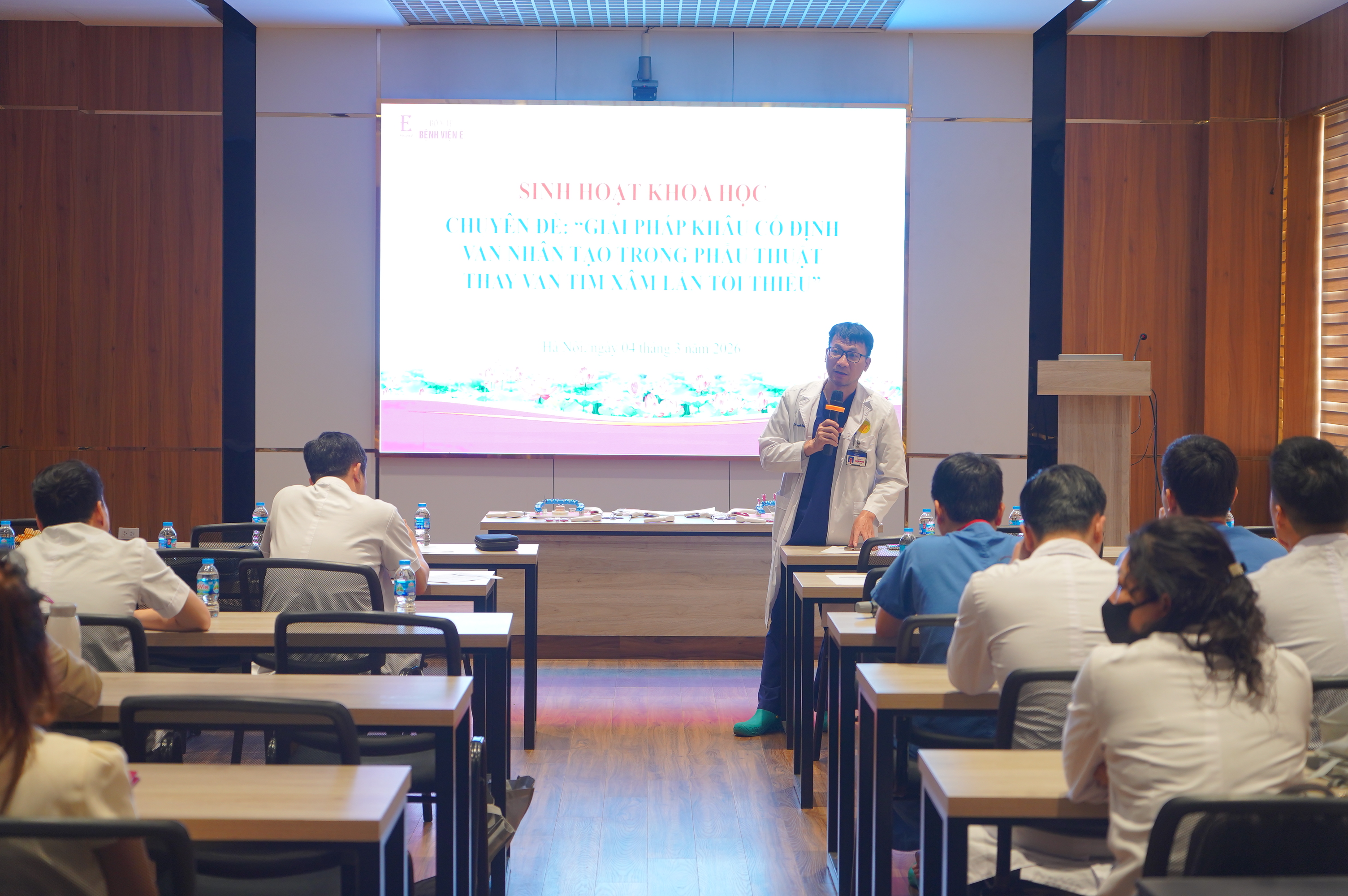Chiều ngày 4/3/2026, Bệnh viện E phối hợp với Công ty cổ phần Vietmedic tổ chức buổi Sinh hoạt khoa học chuyên đề: Giải pháp khâu cố định van nhân tạo trong phẫu thuật thay van tim xâm lấn tối thiểu. Chương trình được tổ chức trực tiếp với sự tham gia của 20 bác sĩ, điều dưỡng công tác tại các khoa của Trung tâm tim mạch, Bệnh viện E.
