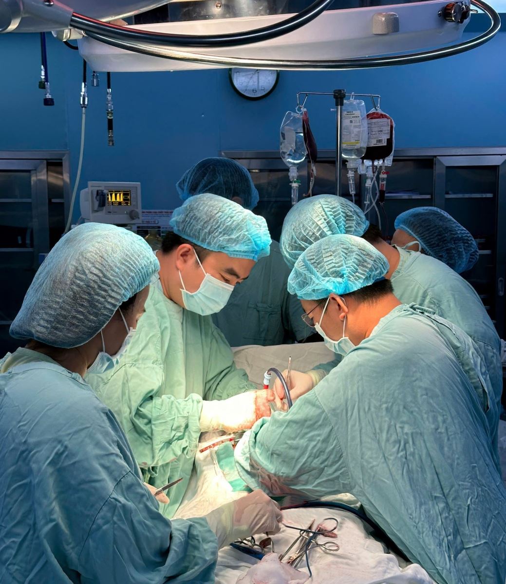 Bệnh nhân vừa hồi sức vừa chuyển thẳng lên phòng mổ để chuẩn bị đầy cho cuộc phẫu thuật. Khoảng 20 phút kích hoạt quy trình ê kíp đã có mặt tại phòng mổ, bệnh nhân và các phương tiện đã chuẩn bị sẵn sàng trong quá trình chờ đợi. Ê kíp phẫu thuật thực hiện dưới sự điều hành của ThS.BS. Nguyễn Xuân Hùng, Phó Trưởng khoa Ngoại Lồng ngực – Tim mạch tiến hành cắt xương ức bộc lộ toàn bộ màng tim, máu đang chảy phụt rất mạnh lượng máu mất khoảng 2,5 lít. Kiểm tra thấy có lỗ thủng lớn kích thước khoảng 2cm tiến hành kẹp lỗ thủng và nhanh chóng khâu lại, kiểm tra cầm máu. Trong quá trình phẫu thuật ê kíp gây mê hồi sức tích cực cho BN và được truyền tổng cộng 1400ml (04 đơn vị hồng cầu khối) và 600ml plasma (04 đơn vị plasma). Cuộc phẫu thuật nhanh chóng hoàn thành và thành công với sự phối hợp của đa chuyên khoa.