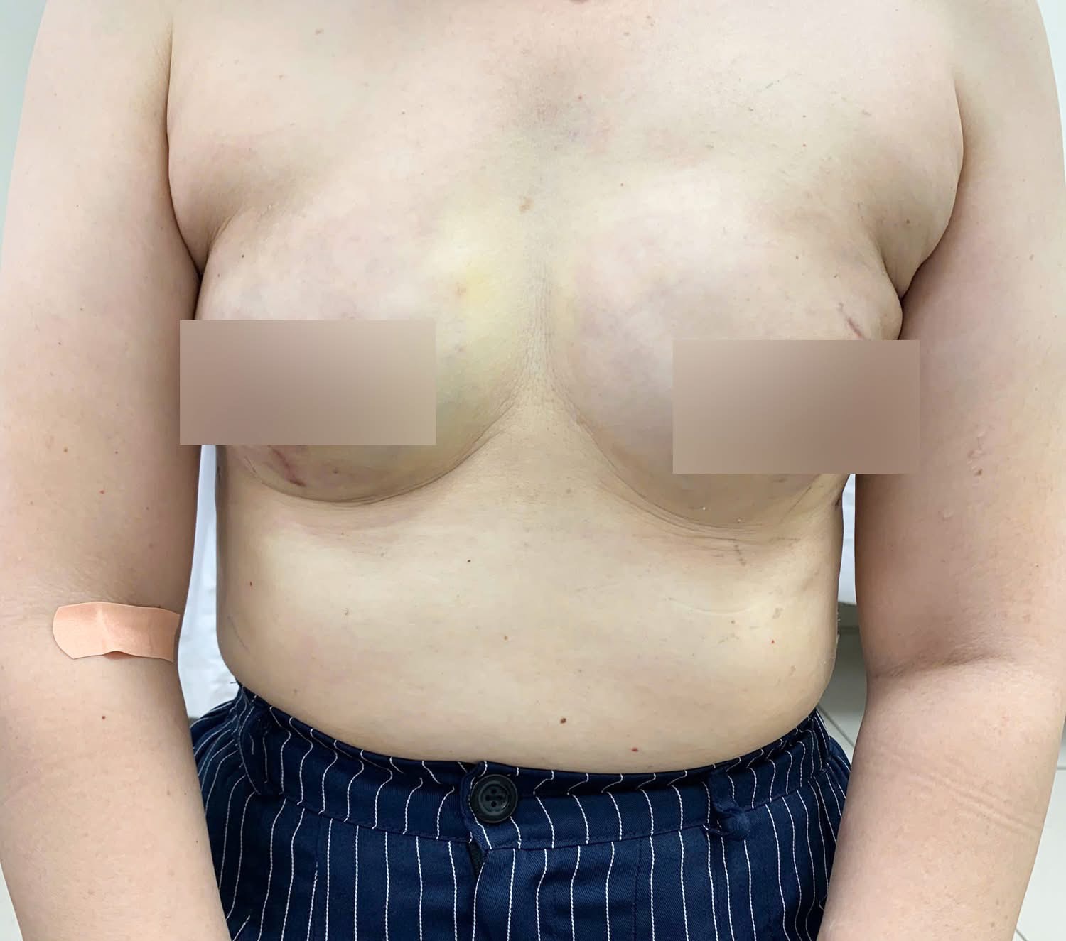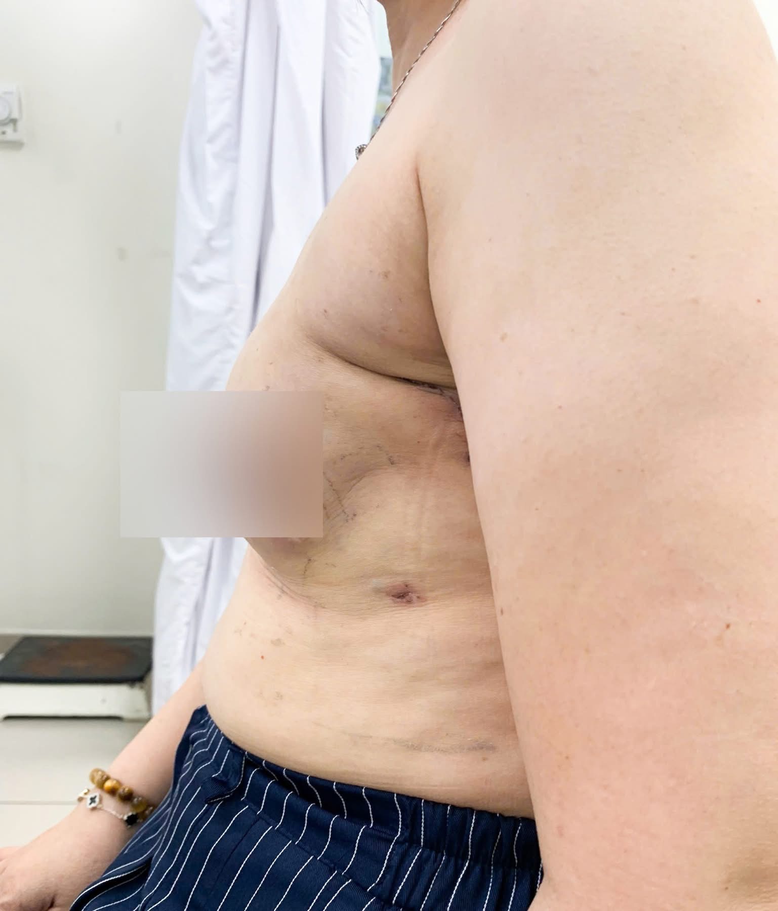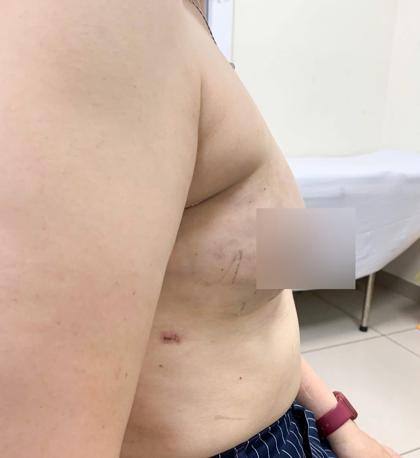 Lúc này, bệnh nhân được ê-kíp điều trị hội chẩn đa chuyên khoa (gồm Tuyến vú, hóa xạ trị, siêu âm, chẩn đoán hình ảnh, tiết niệu) và lập kế hoạch điều trị. Do bệnh nhân có bệnh nền là cao huyết áp, loãng xương, viêm dạ dày, ghép thận đang dùng thuốc chống thải ghép, nên ê-kíp quyết định chọn phương pháp mổ ít xâm lấn đó là mổ nội soi cắt tuyến vú 2 bên, sinh thiết hạch lính gác (Không nạo hạch nách) và tái tạo lại ngực bằng túi độn cả 2 bên.