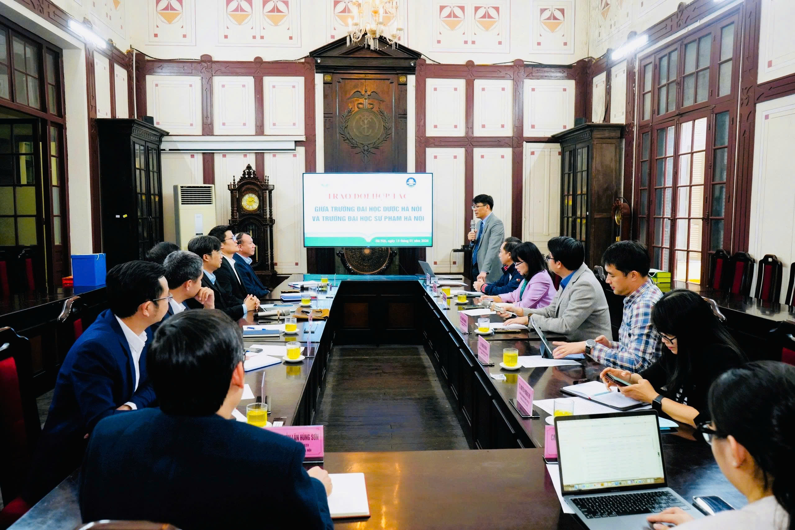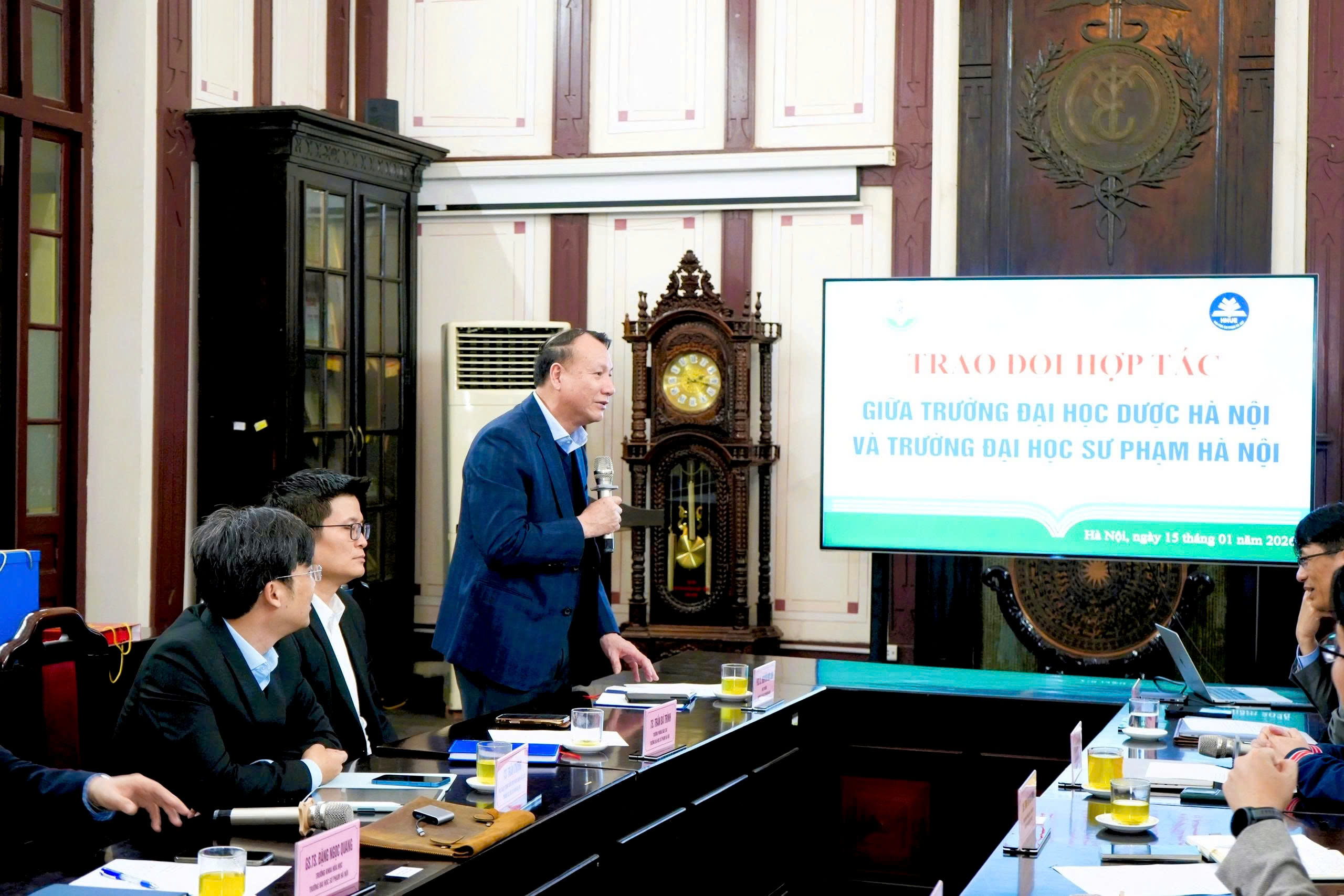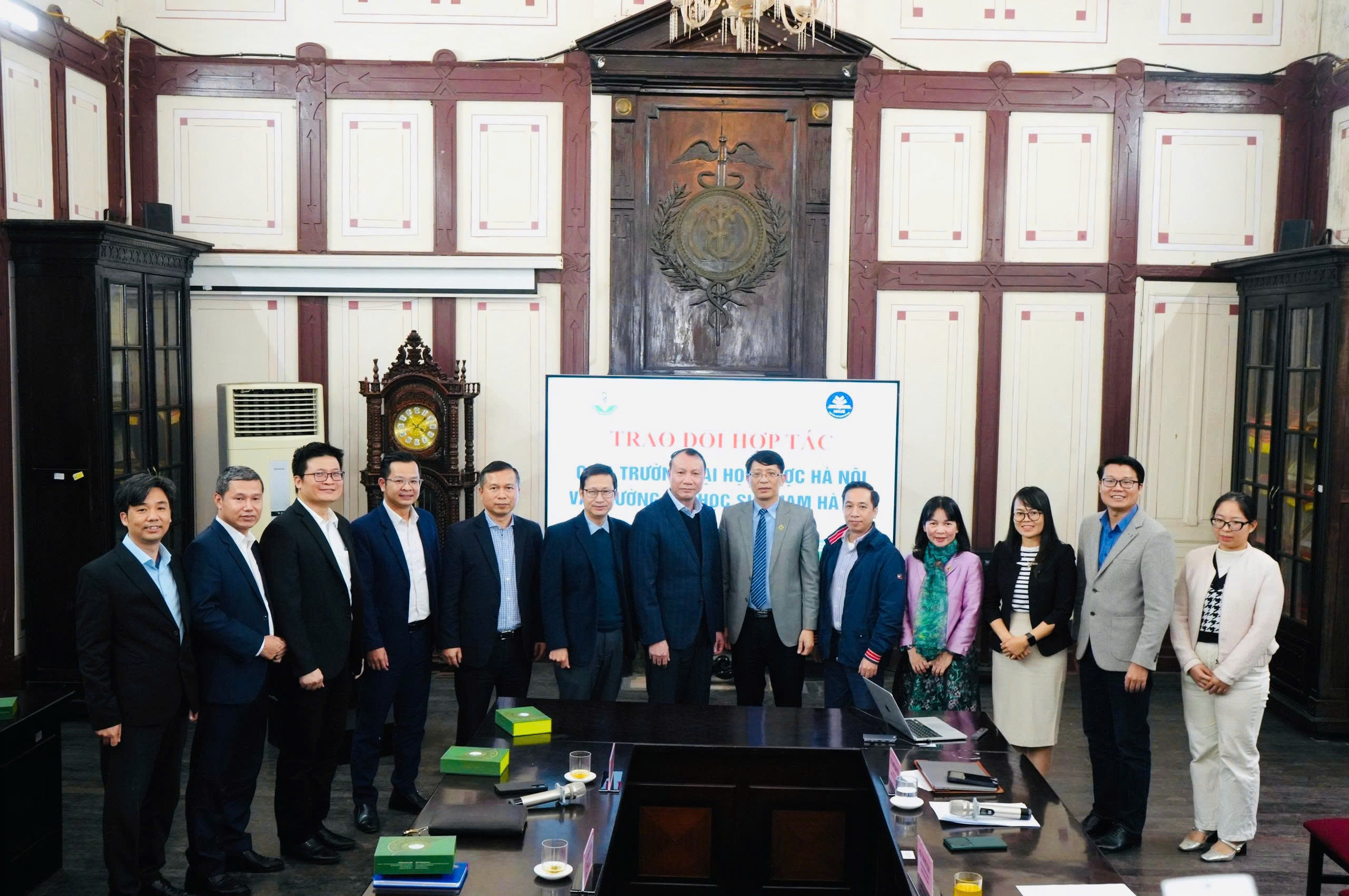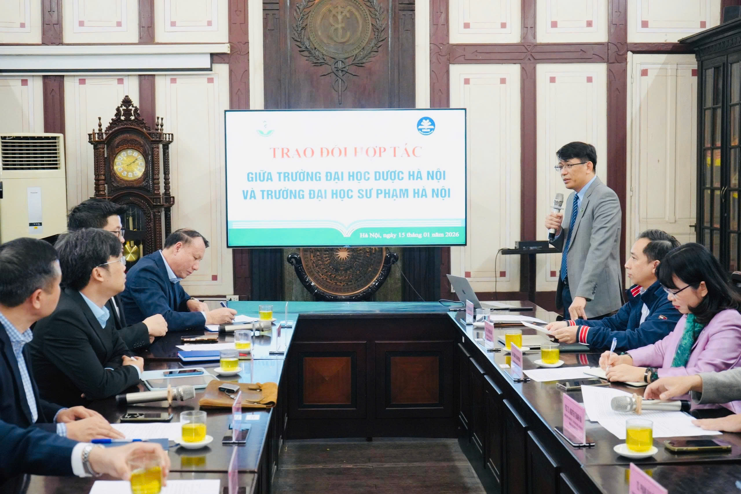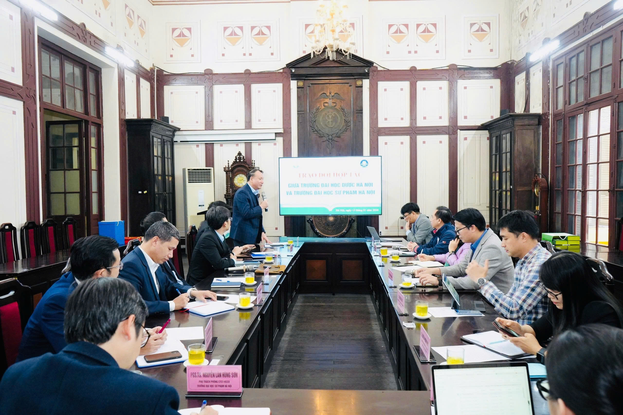 Chiều ngày 15/01/2026, Trường Đại học Dược Hà Nội đã long trọng tổ chức buổi trao đổi, làm việc về hợp tác với Trường Đại học Sư phạm Hà Nội. Buổi làm việc là dịp quan trọng để hai nhà trường gặp gỡ, trao đổi thông tin, chia sẻ định hướng phát triển và thảo luận các nội dung hợp tác trong lĩnh vực đào tạo và tuyển sinh đại học, trên cơ sở phát huy thế mạnh, kinh nghiệm và truyền thống của mỗi đơn vị.