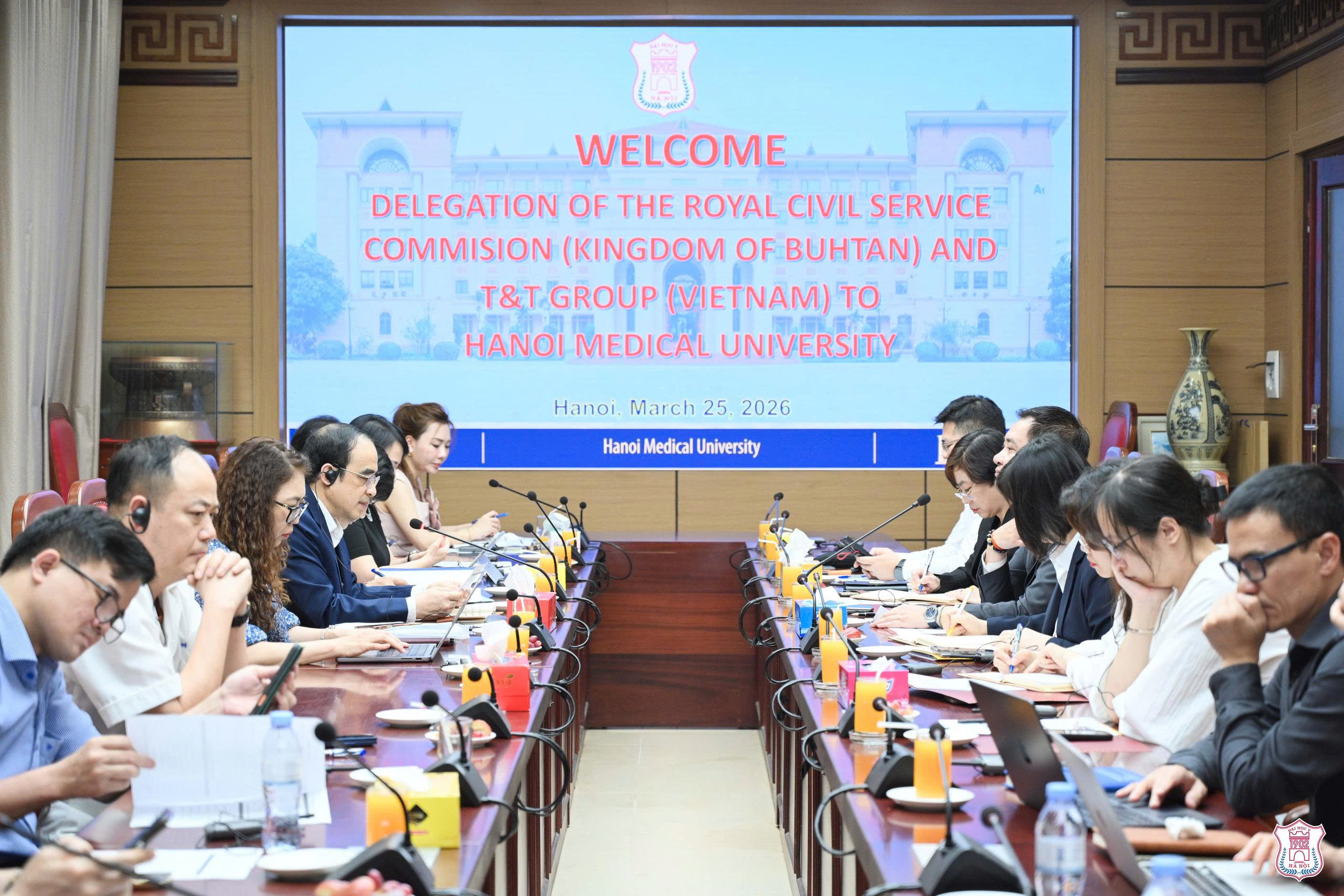 Chiều ngày 25/3/2026, tại Trường Đại học Y Hà Nội đã diễn ra buổi làm việc giữa Nhà trường, Tập đoàn T&T và Ủy ban Dịch vụ Công Hoàng gia Bhutan nhằm trao đổi, thống nhất các nội dung triển khai Chương trình học bổng Y khoa T&T dành cho sinh viên Bhutan. Sự kiện được đánh giá là bước đi quan trọng trong chiến lược quốc tế hóa đào tạo, đồng thời khẳng định năng lực và uy tín của Trường Đại học Y Hà Nội trong lĩnh vực đào tạo y khoa chất lượng cao.