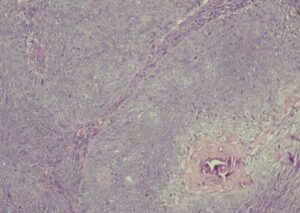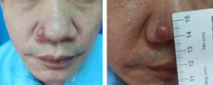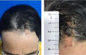 Tháng 5/2023 tại khoa Phẫu thuật tạo hình thẩm mỹ – Bệnh viện Da liễu Trung Ương tiếp nhận một trường hợp bệnh nhân nữ 74 tuổi đến khám với một khối u xuất hiện tại da đầu vùng chẩm. Theo lời bệnh nhân kể, tổn thương xuất hiện từ nhỏ với kích thước tương đương đầu ngón tay. Khoảng 6-7 năm nay, tổn thương tăng kích thước nhanh, biến đổi hình thái kèm loét rỉ dịch. Bệnh nhân chưa từng điều trị trước đó.