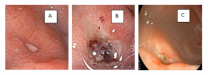 Trường hợp thứ ba: Trẻ nữ, 9 tuổi, không có tiền sử bất thường, vào viện vì nôn ra dịch nâu và chóng mặt. Kết quả xét nghiệm Hb: 69 g/l, Hct: 22%. Trẻ được truyền khối hồng cầu và nội soi dạ dày cấp cứu thấy hành tá tràng có ổ loét kích thước khoảng 1 cm, bờ phù nề, đáy có cục máu đông, bác sĩ nội soi tiến hành phá cục máu đông, cầm máu thành công bằng đốt điểm mạch với Laser Argon và tiêm Adrenalin xung quanh ổ loét. Sau 8 ngày điều trị, trẻ được ra viện và dùng thuốc theo đơn ngoại trú.